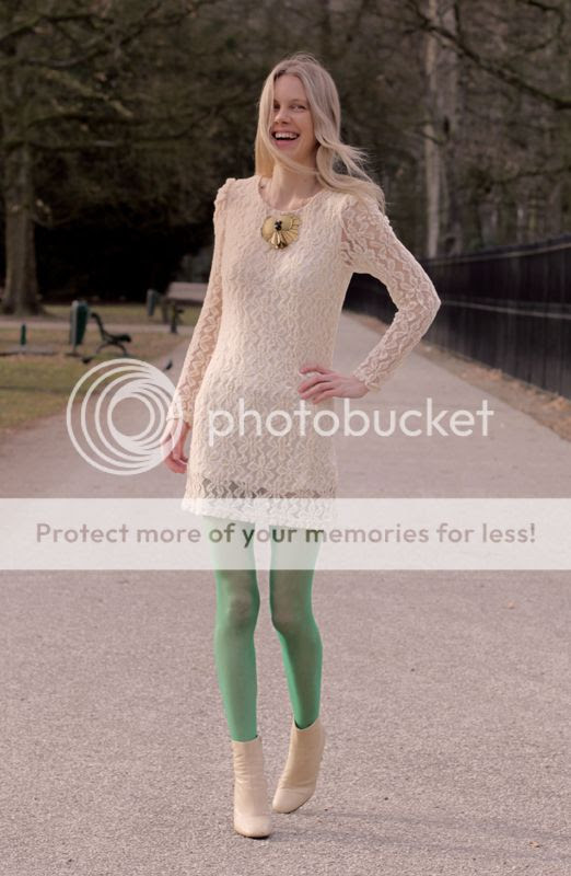 I really start to dig the color-pop on the legs, these are the vintage green tights I was talking about in my last post, I decided to wear them with a yellow-ish cream lace dress (about $15 on Ebay) and yellow-ish/cream Miu Miu booties, the necklace is vintage and.. um ... borrowed from Gemma haha ( Gems you get it back soon, promised ) Lipstick from Givenchy.